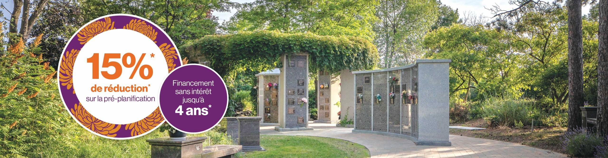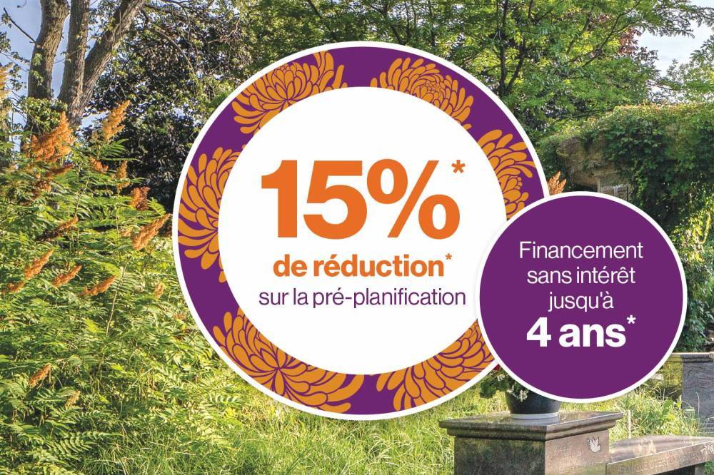 15 % de rabais sur les arrangements complets de cimetière et de funérailles*